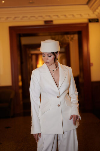 Жакет приталенного силуэта, создающий четкую геометрию силуэта, подчеркивает талию, создает изящную линию бедра. Карманы жакета трансформируются, позволяя носить жакет клапанами наружу или заправлять их вовнутрь. Жакет декорирован дизайнерскими пуговицами из метала, а посадка жакета обеспечивает комфорт, позволяя создать образ для любого случая.